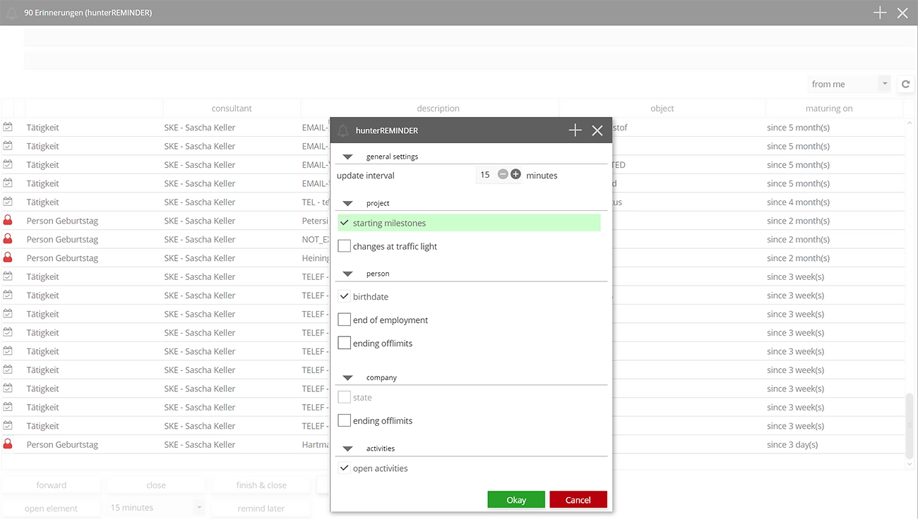 Zudem erinnert der hunterREMINDER an geplante und überschrittene Projektmeilensteine sowie anstehende und noch nicht abgearbeitete Aufgaben. Das Erinnerungsfenster meldet sich auf Wunsch mit einem Signal und listet alle fälligen Termine übersichtlich auf. Aus der Liste heraus lässt sich dann der zugehörige Datensatz zu Person, Projekt, Firma oder Tätigkeit direkt öffnen und auch intern weiterleiten, so dass der jeweilige Nutzer sofort und standortübergreifend die Details zur Hand hat.